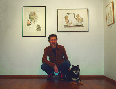 2年ぶりの城芽さんの個展、テーマは初日・平成22年2月22日という「2」並びの日付にちなんで「2ショット」です。城芽さんもギャラリーオーナーの愛犬ぼうとツーショット! |