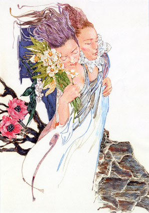 | 普段は人物を単体で描くことが多い城芽さんですが、スウィートであったり、ビターであったり、現実のような、夢の世界のような… さまざまな関係性や物語を感じさせる2人の姿が描かれました。 |