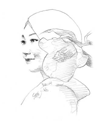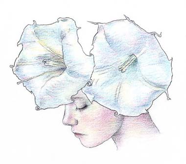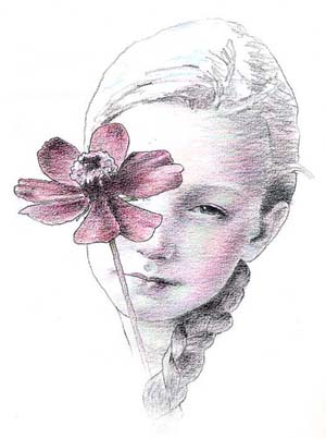 画材は色合いやタッチが好きだということで色鉛筆。なるべく少ない色数を重ねることで微妙な色彩を作り、ミューズコットンなどの紙の目を活かして質感、空気感を表現されています。