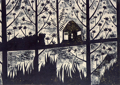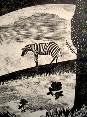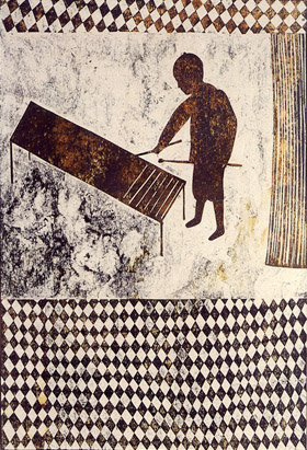 | ボール紙に描いた下絵に沿ってカッターを入れ、表面をペリペリと剥がす部分と残す部分を作り、その後、ローラーを使ってインクをのせていくという技法。 紙版画の版を作るのと同じ要領で制作されています。 |