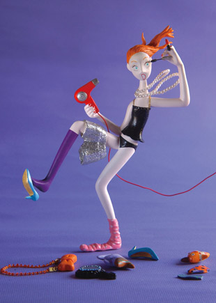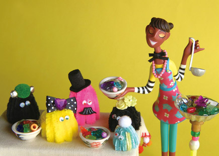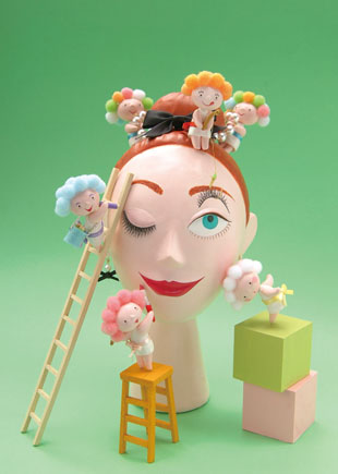 素材の主となるのは石粉粘土。そこに布や木や紙や金属、そして本物のお菓子など様々な素材を小道具として自由に使い、楽しい世界をギューッと濃縮。 下の作品には本物のつけ睫毛が使用されています。 |