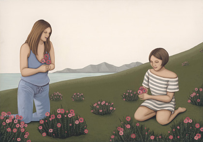 どことなく懐かしさを感じるモチーフ、シチュエーション。 東さんご自身、子どもの頃から古い時代のものに心惹かれるとのことで、 ご自宅ではおばあさまの家具など譲り受けたものが大切に使われているのだそう。 制作の際にも50〜60年代の生活雑誌の写真を資料にすることが多く、 外国の古い雑誌の写真を見るような独特な色感はアクリルガッシュで作られています。 |
