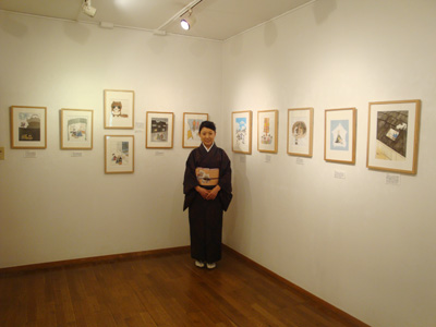 さまざまな雑誌や児童書などで活躍するおぜきさんです。お天気が不安定な一週間でしたが、毎日素敵なお着物姿でお客さまをお迎えしていました。 |