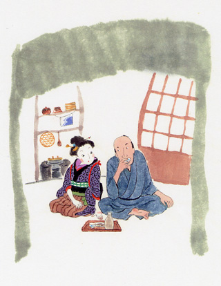 お仕事でも「和もの」を得意として描いていらしたおぜきさんですが、今回はテーマをギュッと絞りたい、と「落語」の世界を描かれました。 |