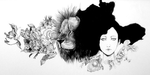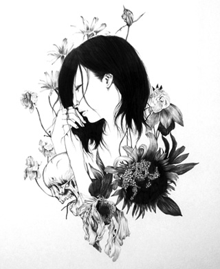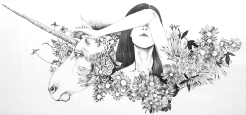 6H〜6Bの鉛筆の濃淡で丁寧に描き込まれた女性、花、動物たち。 |
