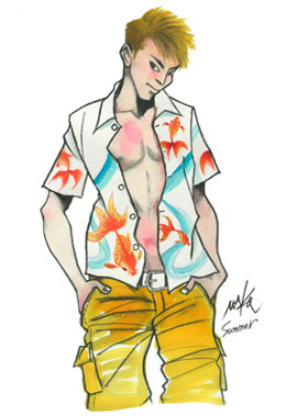 前回の個展では「ランジェリー」をテーマにキュートでセクシーな女の子がたくさん並び、 その頃のお仕事でも「女性像」を描く作家さんのイメージが強くありました。 その後、さまざまな媒体でで男性や子ども、キャラクター的な表現も求められるようになり、人物を観察して描く楽しさをますます感じていらっしゃるようです。 |