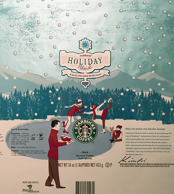 2007年、全世界のStarbucksのクリスマスキャンペーンで使用されたコーヒー豆のパッケージです。こちらは、紙ではなくメタリックホイルに印刷されたものです。アーティストだけに送られるパッケージ見本を額装した非常に貴重な商品です。直筆サイン入り。